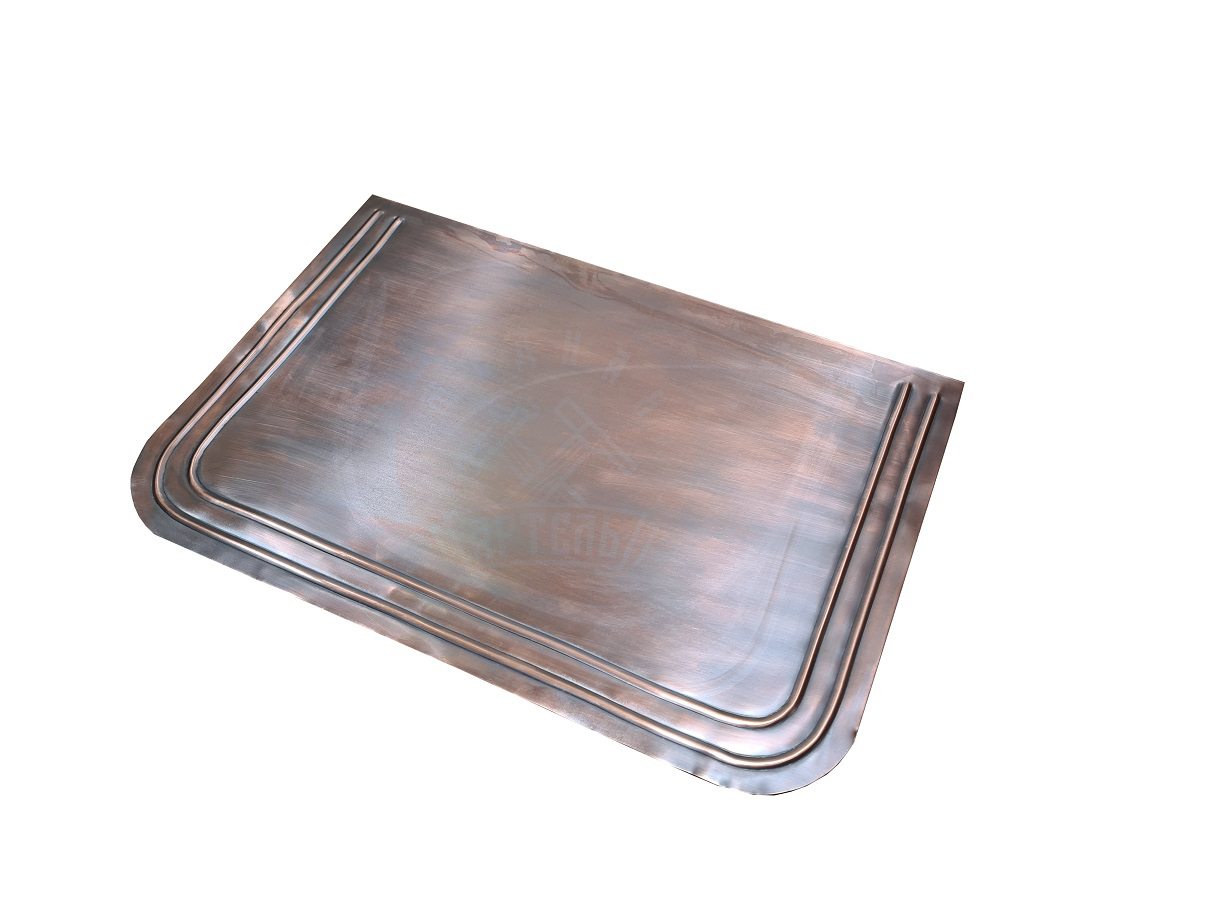 Притопочный лист из меди толщиной 0,6 мм для банной печи с двумя ребрами жесткости. Размер притопочного листа 600х400 мм. Дополнительно обработан и покрыт защитной оксидной пленкой.